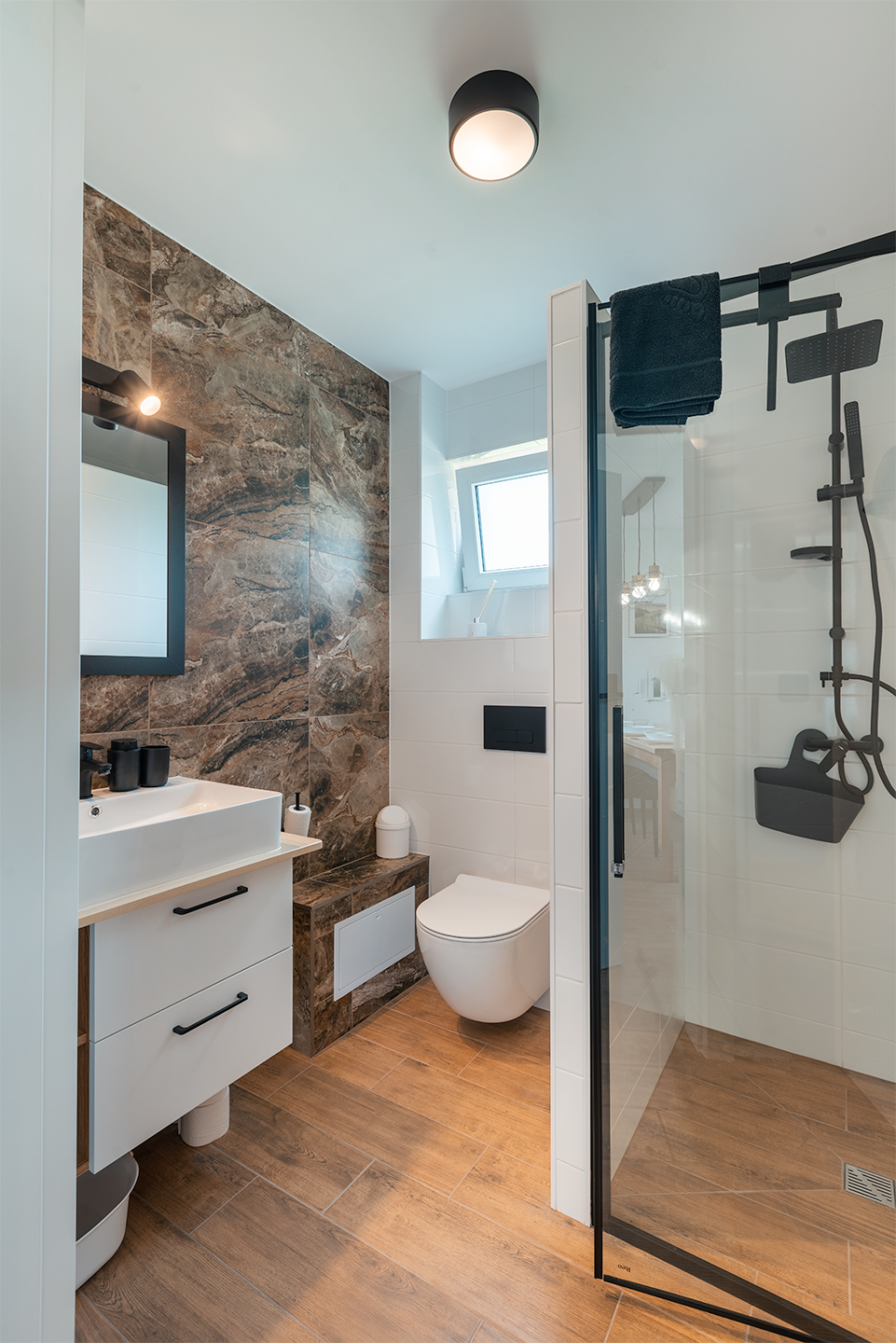 Dodatkowo w salonie i łazience jest elektryczne ogrzewanie podłogowe, natomiast w sypialniach grzejniki elektryczne.